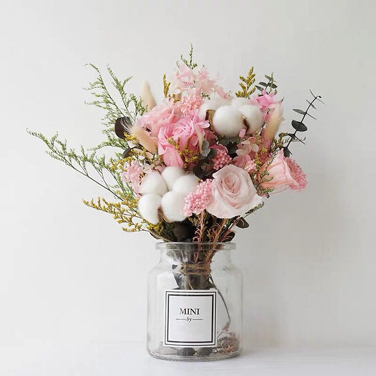 Dieser Blumenstrauß mit pastellrosa Farben ist eine Schaffung von Yaxin aus echten Blumen und natürlichen Laub: Hortensia, Rosa, Eukalyptus und staatlicher Statik ... etc. Alle verwendeten Blumen und Laub werden getrocknet oder stabilisiert, sodass Sie diesen köstlichen Strauß lang nutzen können, ohne das Risiko zu sehen, dass er verblasst ist (mehr als 2 Jahre)