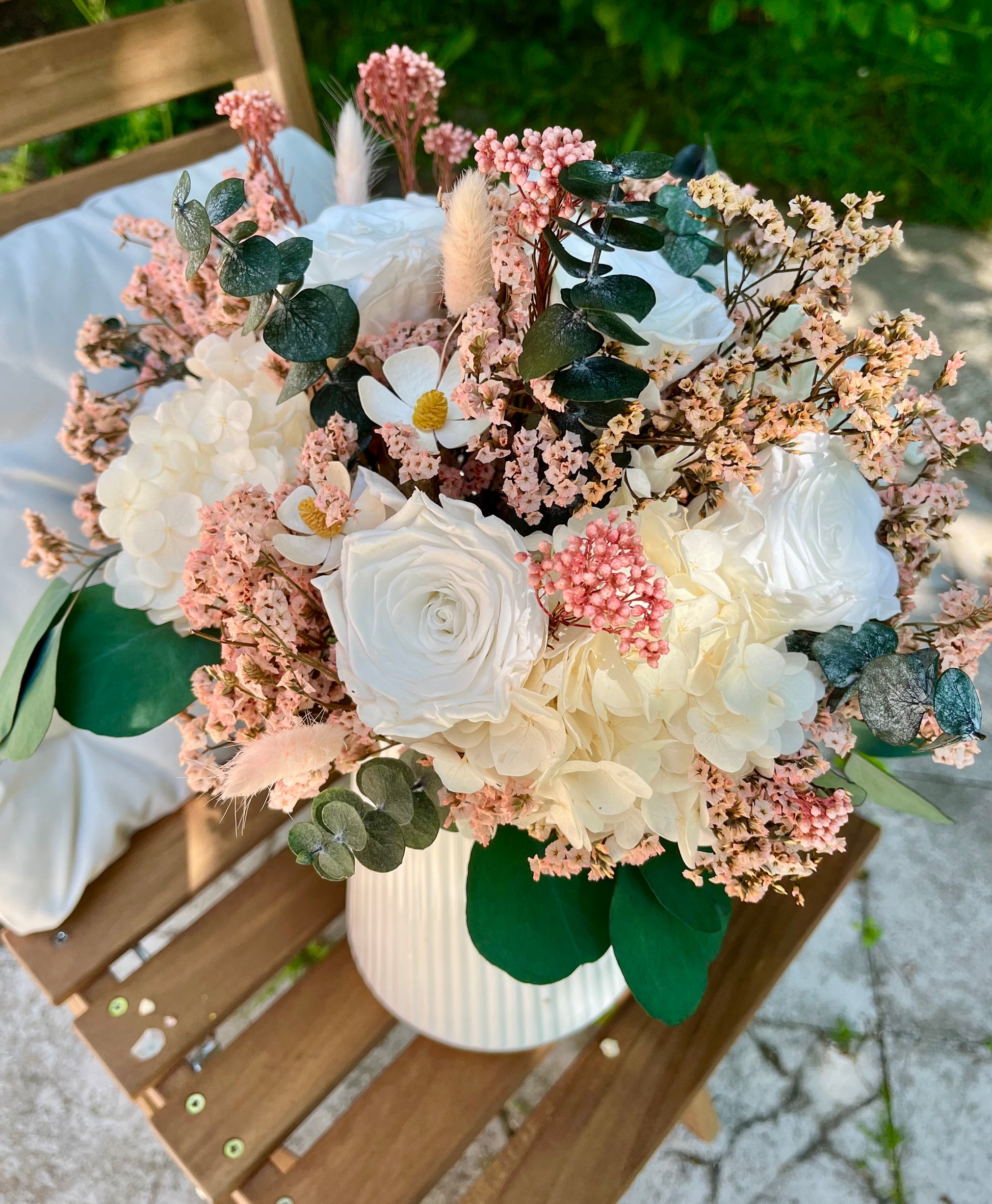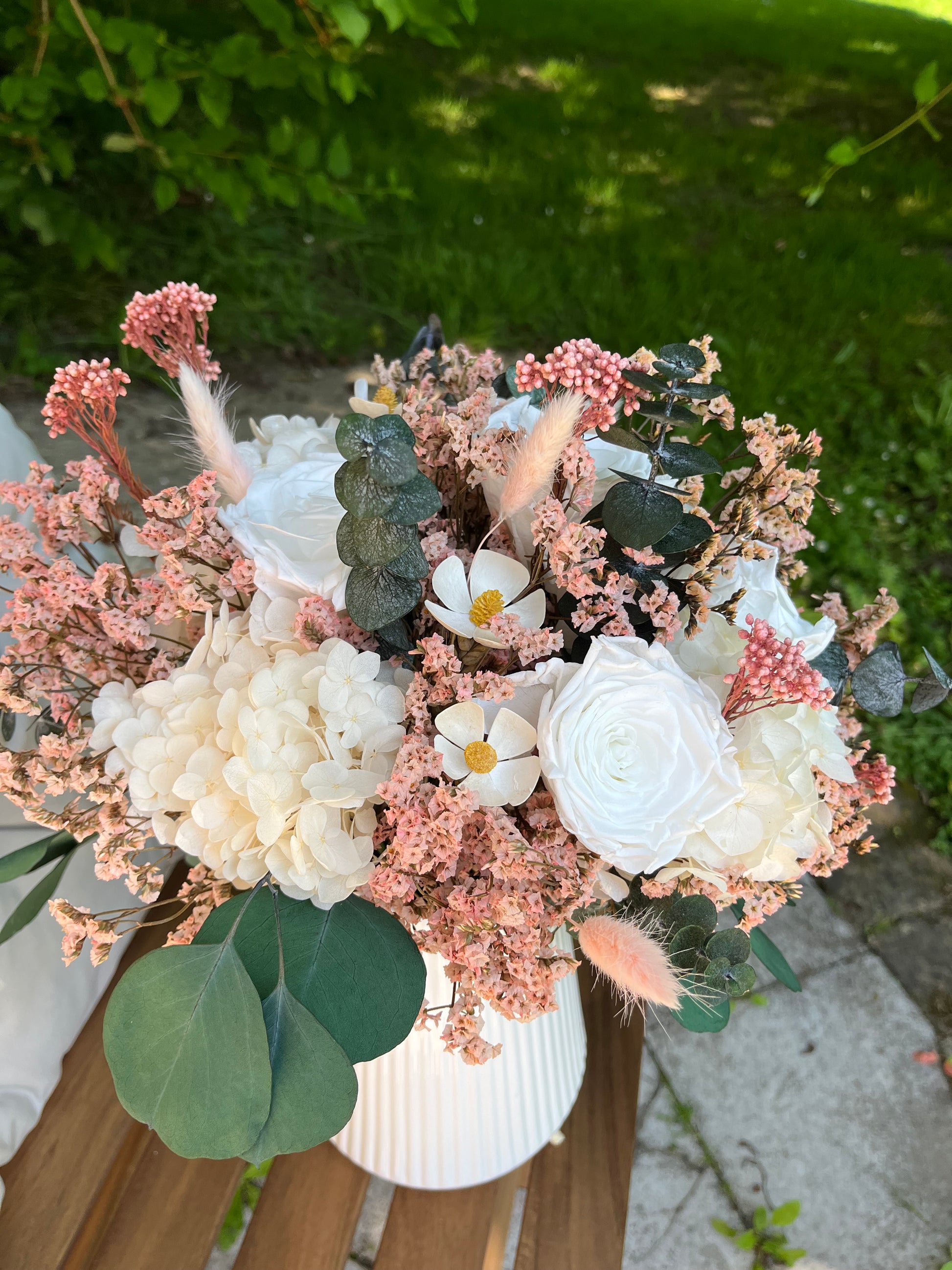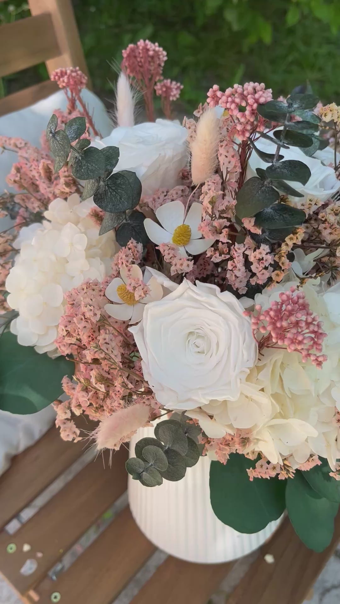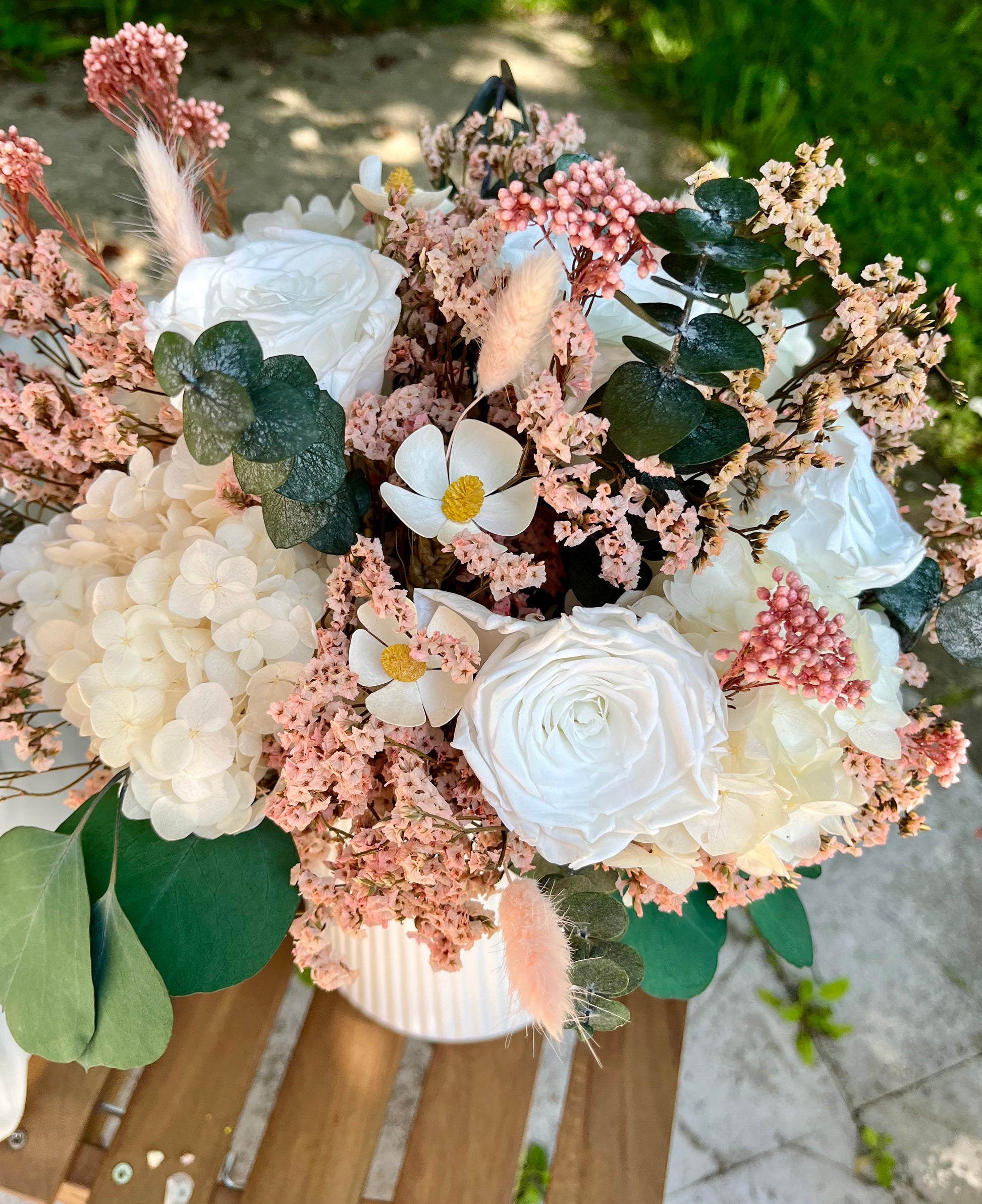 (5 rose stabilisés, 3 hortensia stabilisés ,7 fleur du riz, statice stabilisés, eucalyptus stabilisés etc)