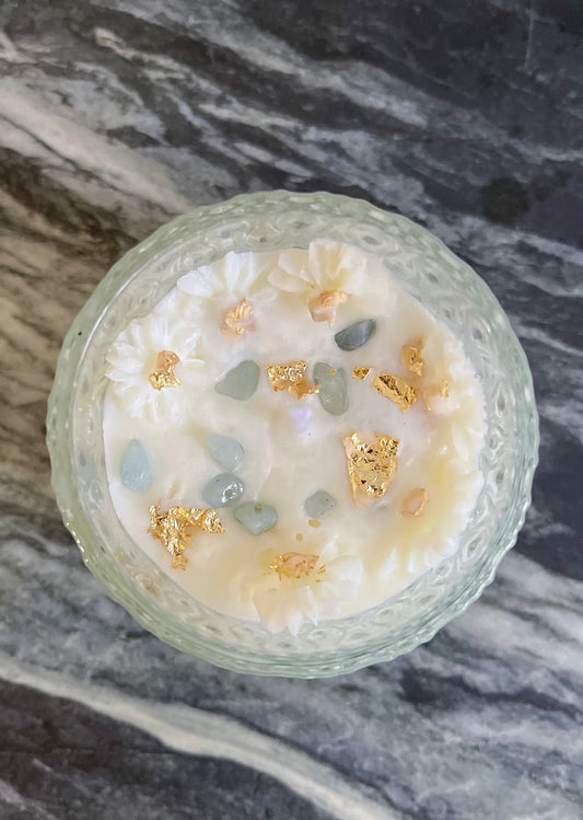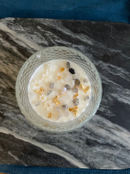 Each candle is adorned with real lithotherapy stones, carefully selected for their beneficial energies, as well as fine gold leaves for a touch of elegance and refinement. Unscented, they focus on the symbolism of the stones and the visual serenity they bring, creating a soothing and harmonious atmosphere.