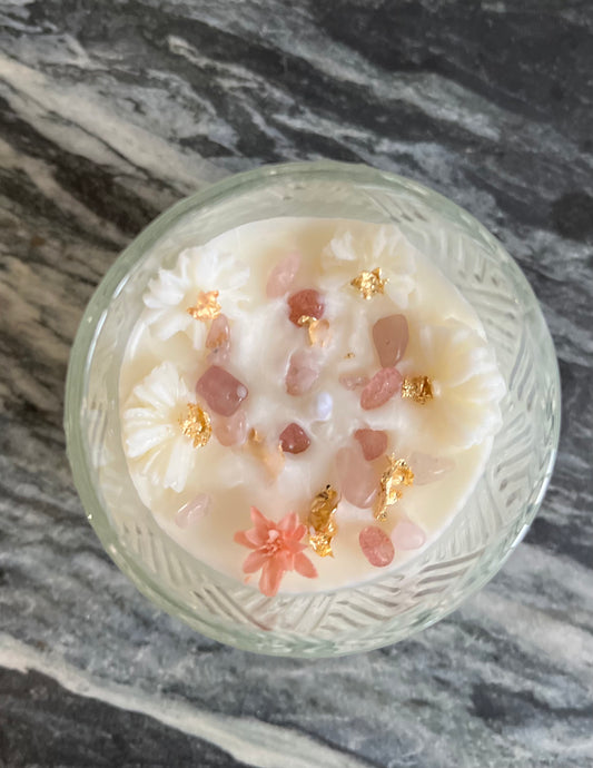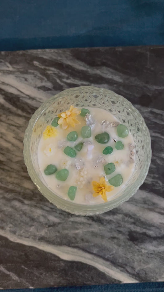 - Lithotherapy stones : each candle is decorated with natural stones (amethyst, rose quartz, aventurine, etc.), chosen for their energy and unique properties.