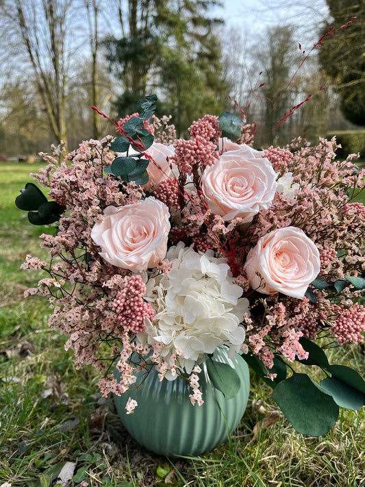 (3 roses, 3 hydrangeas S, statice, rice flower, eucalyptus etc.)