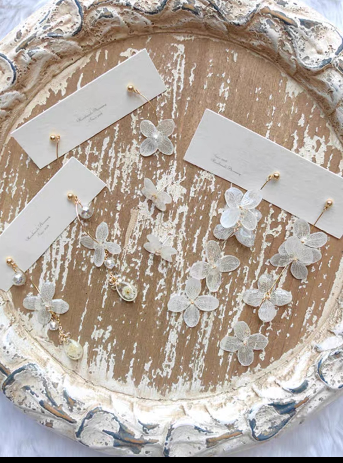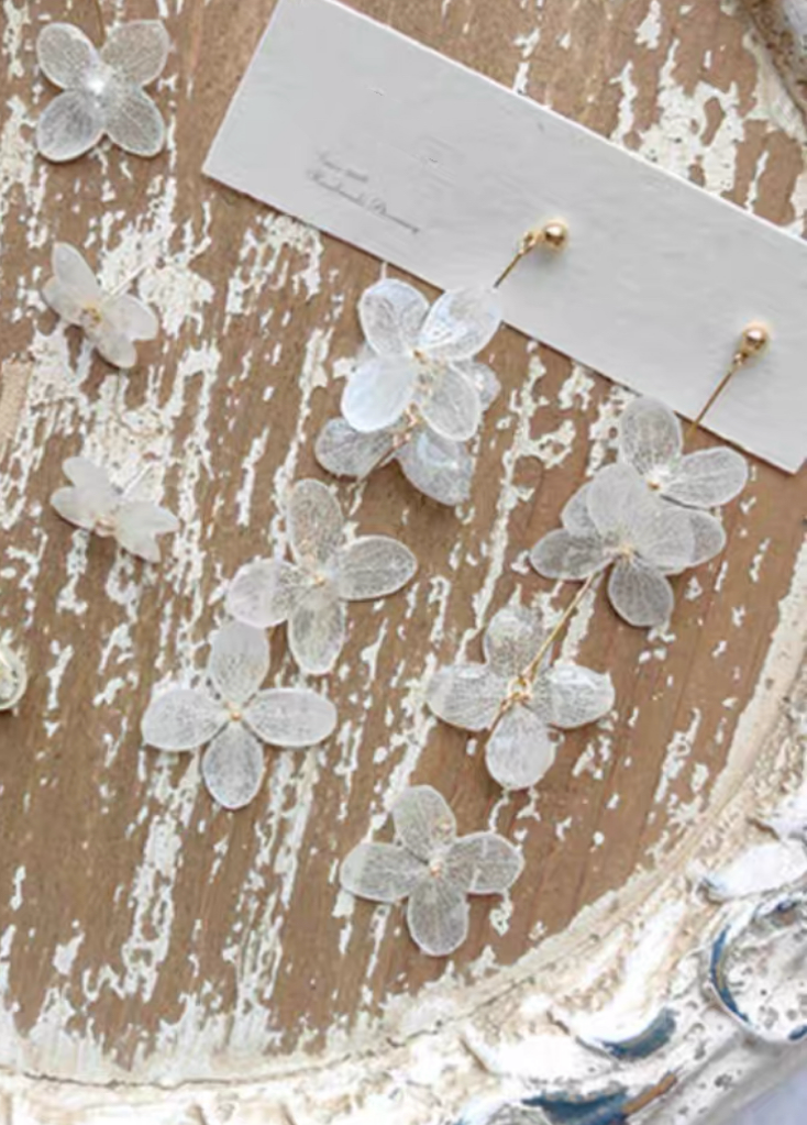 Ces boucles d’oreilles florales, faites main et uniques, mesurent 6 cm de long et 2 cm de large. Dans une teinte blanche transparente, elles sont ornées de 4 pétales pendants qui créent un effet délicat et raffiné. Le design vintage et élégant de ces boucles d'oreilles en fait le choix parfait pour un mariage ou toute occasion spéciale, ajoutant une touche de douceur et de sophistication à votre look. Artisanales et intemporelles, elles incarnent un style floral subtil et poétique, idéal pour sublimer votre tenue avec une élégance unique.