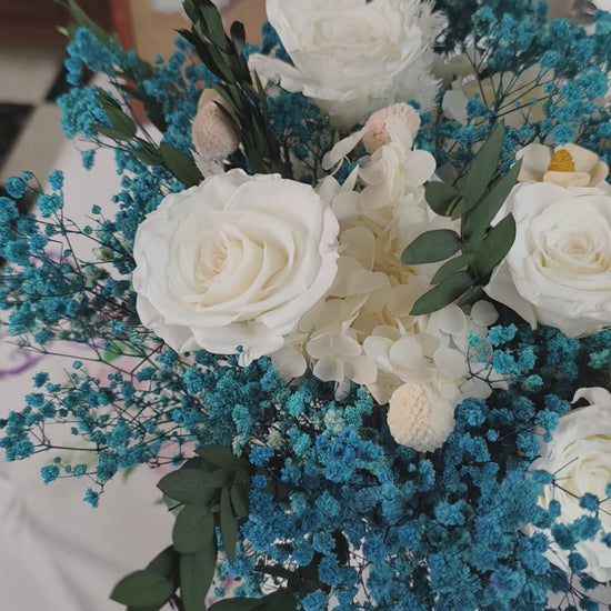 (2 rose ,1 hortensia, ,gypsophile, eucalpthus etc )